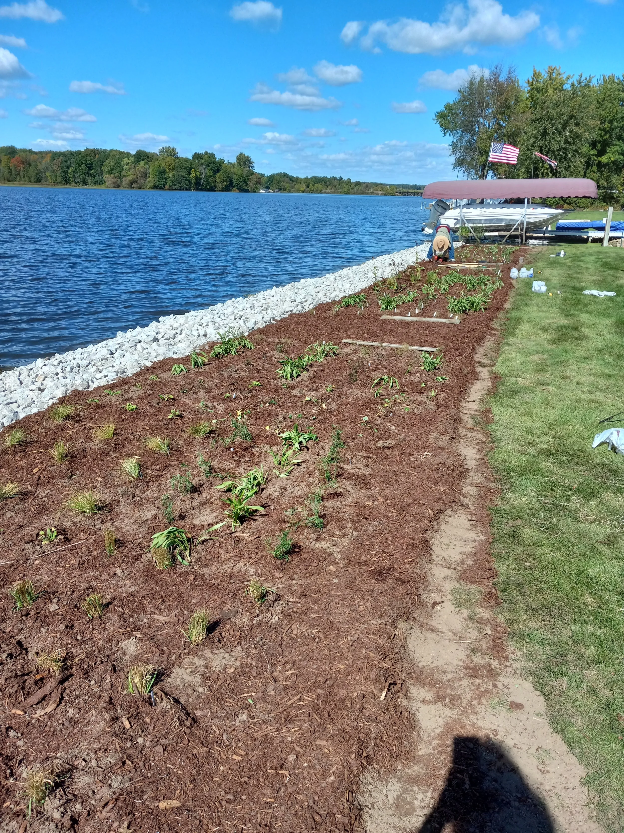 Some of the standout natives in this project include Blue False Indigo, Skyblue Aster, and Tufted Hairgrass—plants that will not only strengthen the shoreline but also bring seasonal beauty to the landscape. The landowners even contributed some of their own native plants, which we were happy to include in the design.